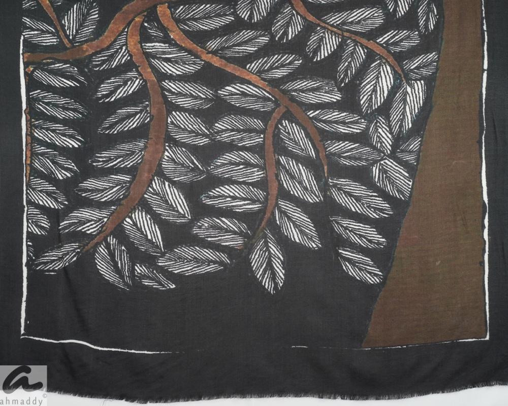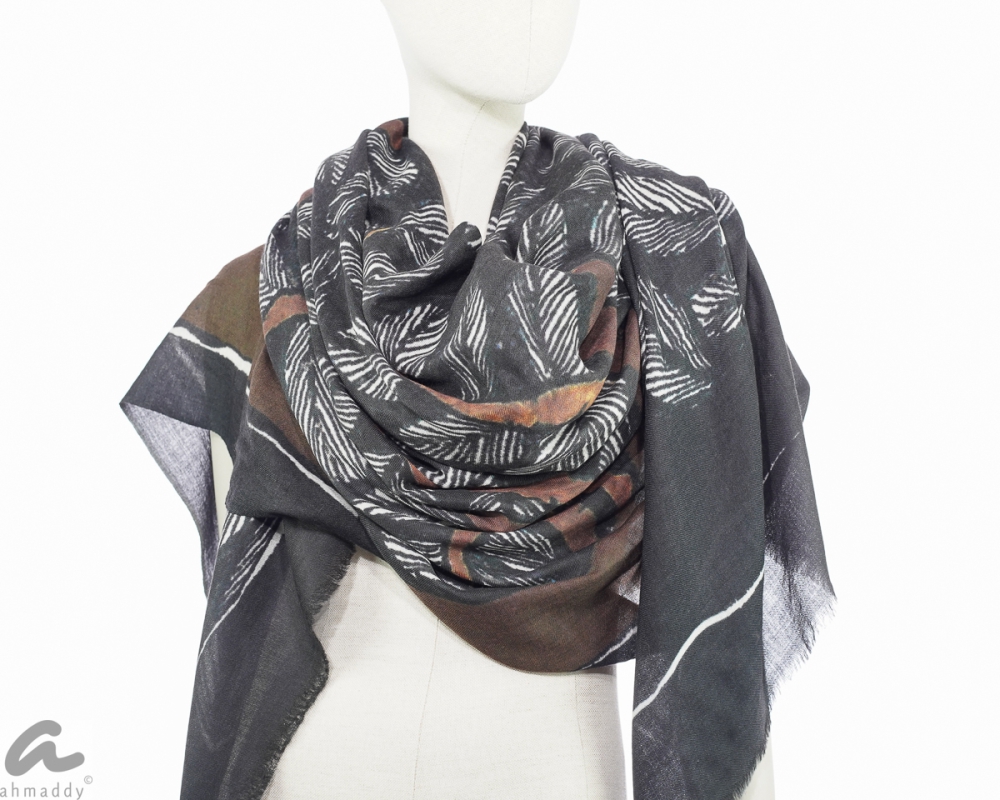 Schöne, ausdrucksstarke Farbkombination in schwarz, braun und weiß. Sehr attraktiver und ausgefallener feiner Wollschal mit Seidenanteil.